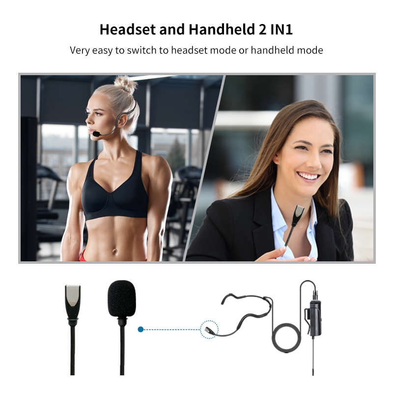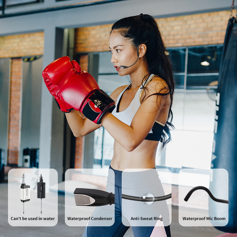 About this item【Stable and Comfortable】The fitness instructor microphone is designed for fitness coach and anyone requiring sports. Beautiful curves and simple shapes can effectively improve the stability and comfort of the product. It was simple to connect and fits perfectly around the head. The humanized structure design won't fatigue you during high-impact use, even when moving, dancing, etc. The waterproof and sweatproof design enhances the customer's experience and product life.【 IP56 Super Waterproof】The fitness instructor microphone wireless system that picks up sound consists of dust-proof anti-corrosion shell and a professional waterproof condenser. It can effectively eliminate environmental interference and achieve high fidelity and restoration of voice reception. In addition, the gooseneck and wireframe headset are both built of waterproof sweatproof materials. We aim to provide a reliable and comfortable microphone for fitness customers.【Plug and Play】The UHF fitness instructor microphone adopts international UHF wireless transmission which can connect automatically within 2s. Package included a 6.35mm(1/4") adapter and 3.5mm(1/8") adapter for voice amplifier, audio mixer, and outdoor speaker. When you use this mic on laptop/computer, please order a USB sound card. Once you install the mic into your device with suitable adapter, you can get the best sound quality by recording the audio or video.【Rechargeable】The fitness instructor microphone wireless transmitter & receiver are powered by built-in Lithium batteries. They can be charged simultaneously with the dual USB cable. The indicator light will turn red when charging and go out when fully charged. Transmitter and receiver can be fully charged within 2 hours and be used for 6 hours. Please use the 5V, 1A-2A charger for charging. The charger is included. Package includes a high-quality carrying case, easy to storage and carry.【Designed For Fitness】The fitness instructor microphone can be used as a general wireless headset microphone. The wireless transmitter is fixed on the head bracket. It can help you get rid of shackles of cable for maximum comfort and freedom of movement. The wireless microphone is suitable for fitness instructors, spinning coach, aerobics coach, Yoga coach, Pilates coach, water sports, gym teacher, teacher, speech, YouTube video/audio recording and so on.