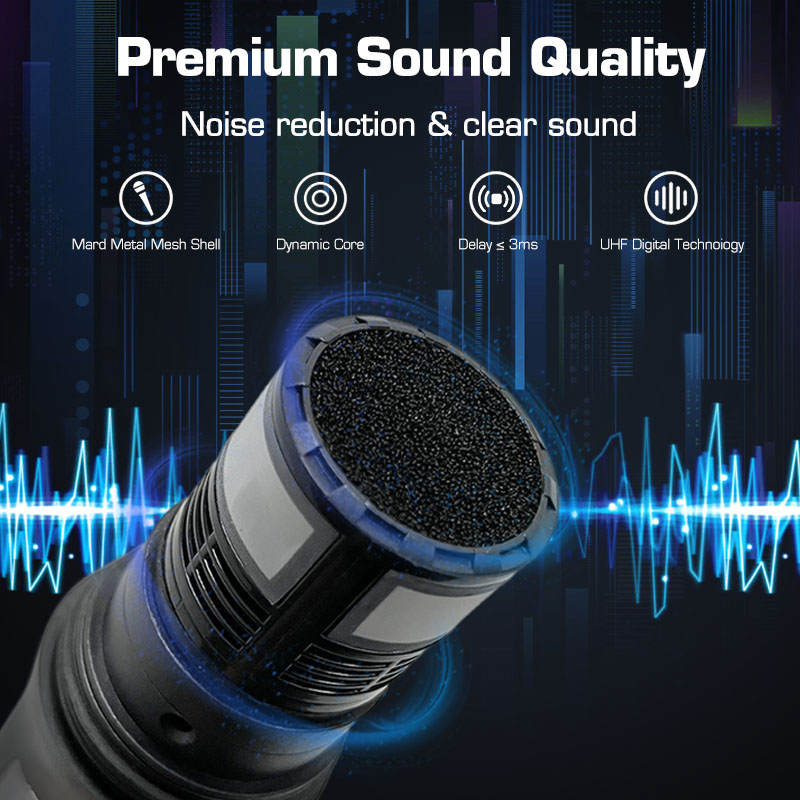 【High-Quality Materials】The portable wireless microphone adopts metal aluminum tube, and the net head is made of metal baking varnish, which is has strong impact and corrosion resistance safe and fall-proof and sturdy.The microphone system with excellent appearance, high-quality materials, easy to use, will be a great gift for family or friends!