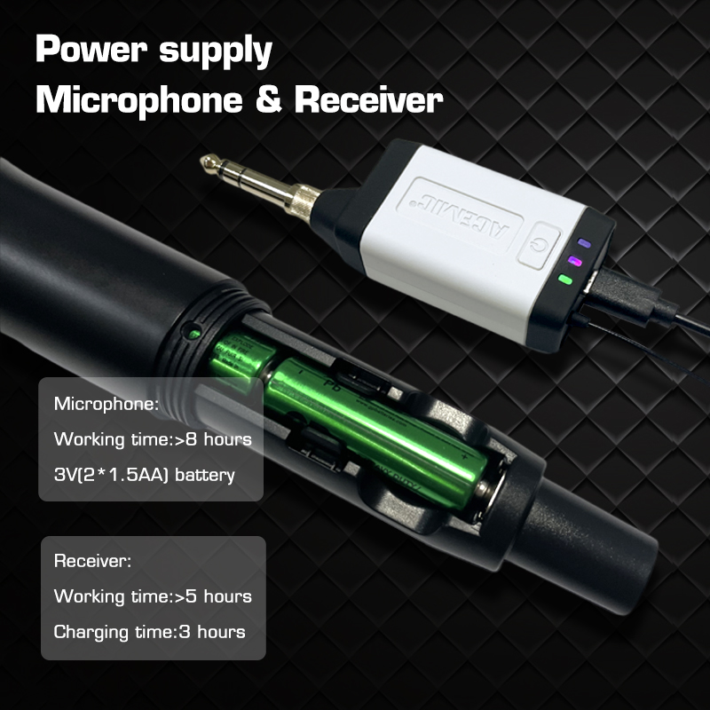 【 Rechargeable & LED Display】The portable wireless microphone system receiver can be rechargeable. No need to set! The transmitter requires 2 AA alkaline batteries which can last for about 8 hours, the receiver's lithium battery can last for 6 hours. The handheld microphone has a LED display, so you can clearly see the battery, channel and signal., don't worry about suddenly not working.