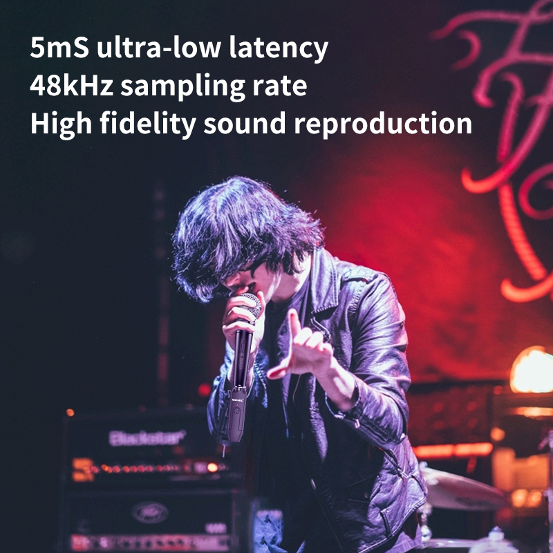 Operating Range: 30m, 99ftSpecificationsOperating range: 30m in open areaLatency: < 5 msFrequency range: 2.4GHz, can be used globallyCompatible device: dynamic microphone, connected to mixer or active speakerChannel: maximum 6 channelsPower requirement: built-in lithium battery, 8 hours continuous useDynamic range: 98dBSample rate: 24 Bit/48KHzFrequency response: 20Hz-20KHzSignal To Noise ratio: 95dBBattery capacity: transmitter 600mA, receiver 800mAPower consumption: transmitter 57mA, receiver 45mA