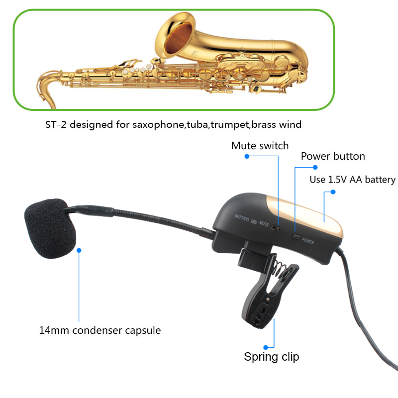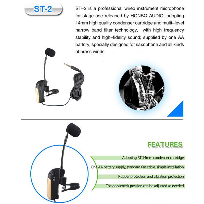 DetailModel: ST-2SpecificationsPolar Pattern: UnidirectionalCapsule Size:Φ14*6.5mmSensitivity: -47dB±2dBFrequency Response: 20Hz-20KHzOutput Impedance:≤680KΩWorking Voltage: 1*1 .5V AA BatterySignal/Noise Ratio: > 58dBCable Length: 6m