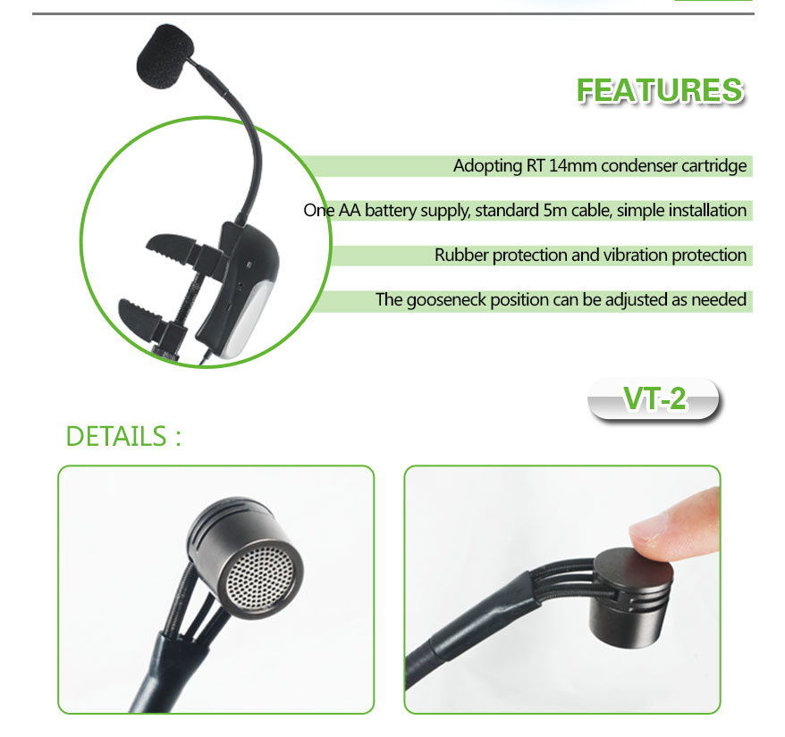 DetailModel: VT-2SpecificationsPolar Pattern: UnidirectionalCapsule Size:Φ14×6.5mmSensitivity: - -47dB2dBFrequency Response: 20- -20KHZOutput Impedance:≤680KΩWorking Voltage: 1×1 .5V AA BatterySignal/Noise Ratio: > 58dBCable Length: 6m