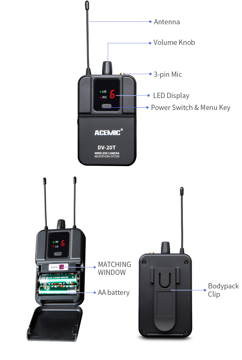• Compatible with All : Receiver with 3.5mm interface, comes with two 3.5mm cable, DSLR camera wireless microphone can work with your laptop/PC/DSLR Camera/Amplifier/DV/Camcorder/Smart phone/Mixer, etc.