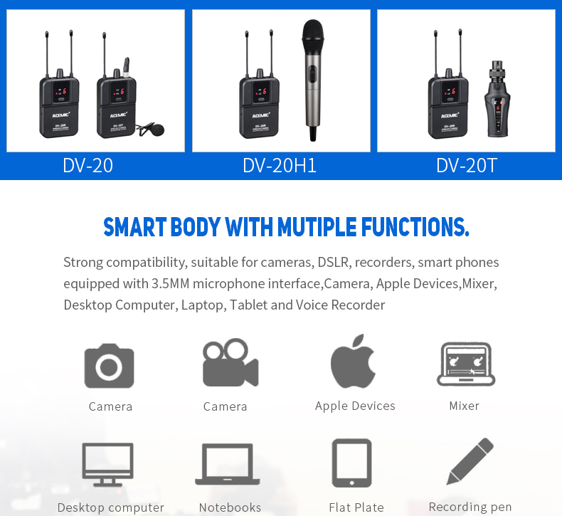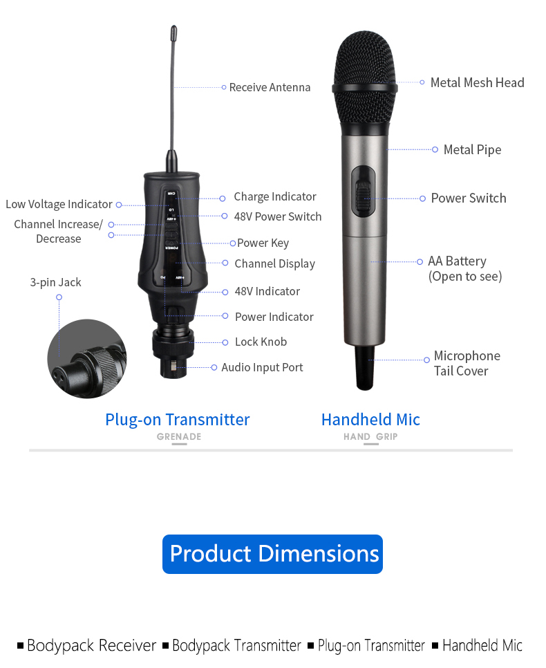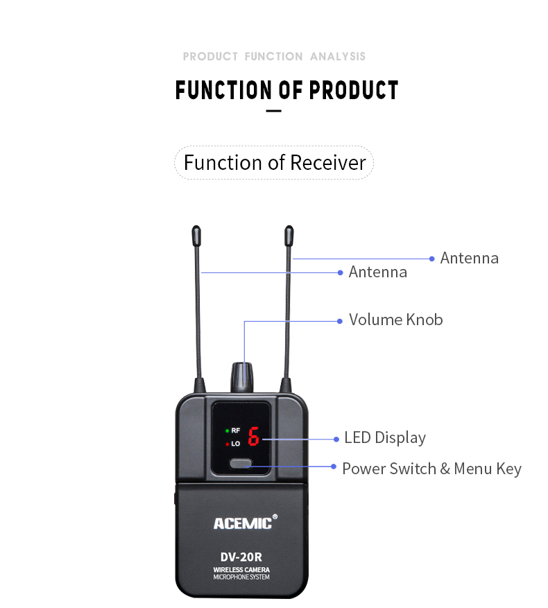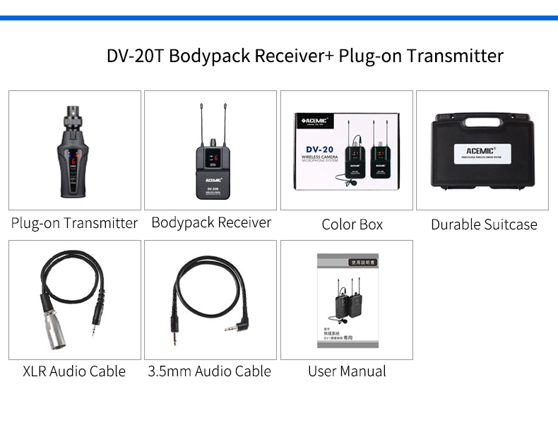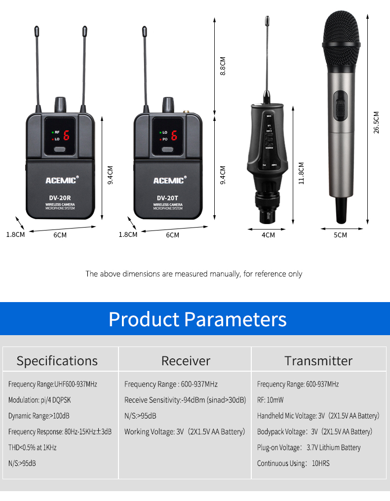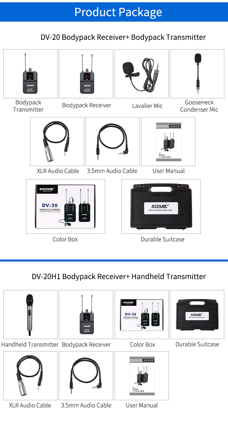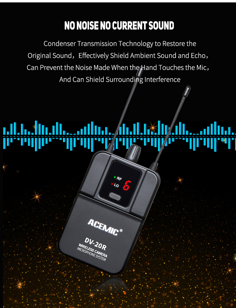 • Compatible with All : Receiver with 3.5mm interface, comes with two 3.5mm cable, DSLR camera wireless microphone can work with your laptop/PC/DSLR Camera/Amplifier/DV/Camcorder/Smart phone/Mixer, etc.