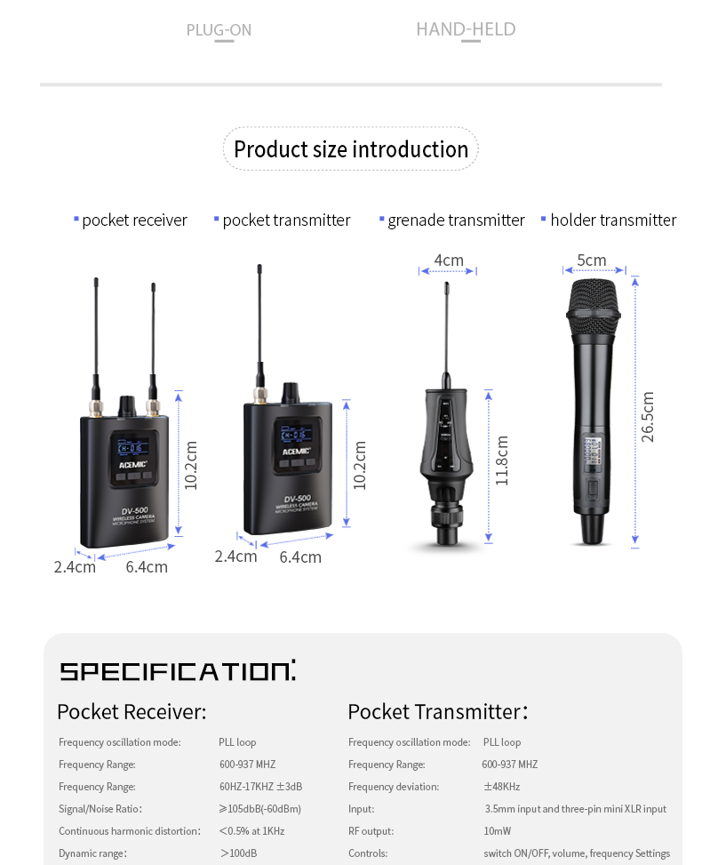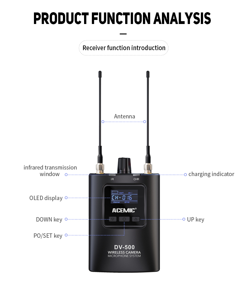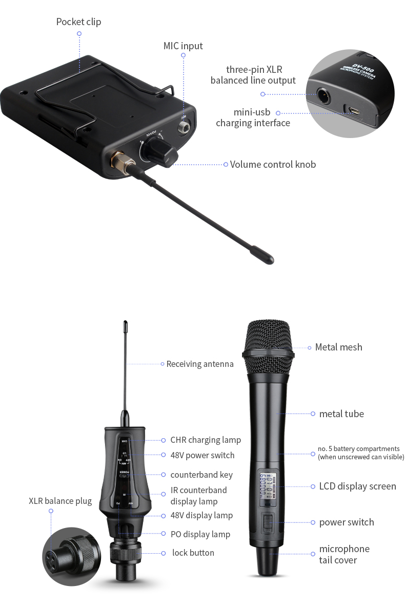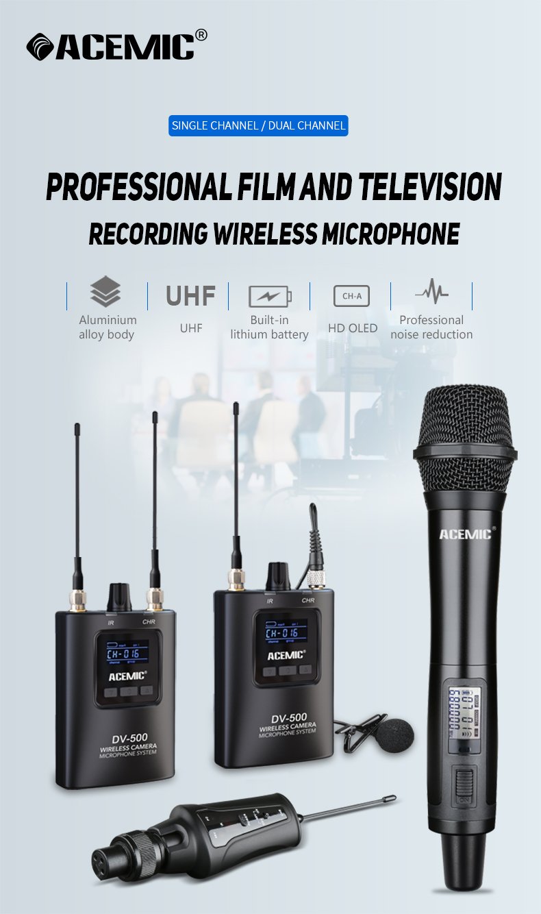 About this item:【Superior Sound & Noise Reduction】The wireless camera microphone features UHF Ultra High-Frequency radio wave technology and dual-antenna design, which enhances the anti-interference ability to ensure stable signal transmission and record clear sound. It features intelligent noise reduction function, can significantly reduce environmental and wind noise.【Wide Compatibility】You can mount the receiver to DSLR Camera, XLR Camcorder, iPhone, Android smartphone, Laptop and PC. The wireless camera microphone is widely used for YouTube live streaming, Vlog recording, interview, program hosting, podcast, presentation, church, wedding.【100 Selectable UHF Channels】The wireless camera microphone package includes 1 Receiver+2 transmitters, so the DV-500Dual support 1-2 people recording at the same time. Every transmitter can select 2 channels, flexible channel matching. When other channels are disturbed in the same space or near distance, you can quickly switch the channel to prevent interference. Working range of the microphone system up to 164 feet (50 meters) in open areas.【Charge and Work Time】The Transmitter and Receiver are built-in 1000 mAh rechargeable lithium-ion batteries that can offer about 6-8 hours working time. USB cable has several mini USB for charge for the transmitters and receiver at the same time, fully charge is only 2.5 hours. The red light is on during charging and goes off when fully charged.【Real-time Audio Monitoring】Connect your favorite headphones to the receiver's 3.5mm headphone jack, you can listen the sound while recording, and monitor the audio status to complete the recording at one time. Daylight-readable displays on the transmitters show volume, battery status and channels.The wireless camera microphone display on the receiver show connection quality of every transmitter and battery status.