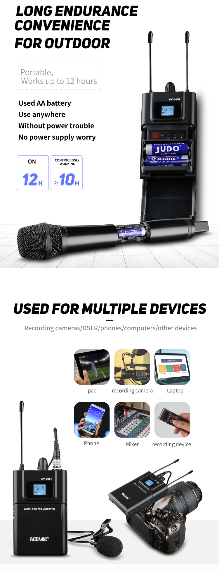 About this item:【100-Channel】The UHF dual wireless DSLR microphone triggered by one receiver which can be used for multiple devices working together, Adjustable RF signal strength or auto-scanning for quick channel selection to A/B group.The wireless microphone for DSLR features Intelligent Noise Cut and manual/auto IR sync, perfect for interviews, Youtube videos and other platform shoots.【Antenna Diversity, Long Working Distance】Wireless DSLR microphone has a working distance of up to 328 feet (100 meters) in open areas. With an audio dynamic display bar on the LCD display, it provides clearer and more stable audio capture, which is perfect for outdoor interviews, video podcasts.【Real-time Monitoring】This wireless DSLR microphone features real-time monitoring on the receiving end and power monitoring on the transmitting end. Simply plug the headphones into the receiver's 3.5mm jack to monitor the audio status in real time. The LCD screen clearly shows signal strength, battery, recording and other functions.【Strong Battery Life】The wireless DSLR microphone is powered with AA batteries, working time up to 10 hours. So you are available to record videos outdoor with more AA batteries, recording and broadcasting all day without pressure.【Multifunctional Wireless DSLR Microphone】The 3.5mmTRS-TRS audio cable/3.5mm TRS-XLR audio cable is compatible with Canon, Sony, and Panasonic DSLR cameras and camcorders. Widely used in YouTube, Podcast Vlog live broadcast, video recording, interviews, program hosting, speeches, churches, weddings, etc, providing first-class clear and distortion-free sound.