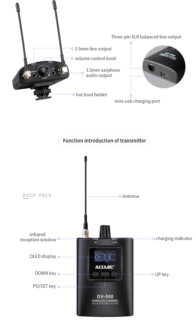 About this item:【Superior Sound Quality】Wireless microphone for DSLR camera receives crystal clear sound and then transmits it to your DSLR camera through UHF digital wireless technology. The recorded sound is processed by noise cancelling to restore high fidelity, and the 0s delay transmission range is 164 feet (50m). UHF digital can provide a stronger signal which reducing the interference of Bluetooth or WiFi.【Good quality omnidirectional lavalier】Get crystal clear sound with this wireless microphone for DSLR camera, perfect for interviewing or recording videos - and do it from any device! The DSLR microphone can work with any Android or iPhone mobile, iPad, desktop, DSLR camera, and laptop.You can use this lapel mic on an interview subject or for YouTube, networking, and audio videos.【Plug-and-play mic】Unlike other microphones, this wireless microphone for DSLR camera uses omnidirectional sound pickup technology and high-specification metal material. It comes with 100 channels and delivers different frequencies. And choosing a frequency is easy; just press the button on the transmitter. This lapel microphone is fairly well put together with a reinforced premium metal clip that helps keep it firmly connected.It is a simple plug and play option for the majority of mobiles, tablets, and cameras, making it one of the best wireless camera microphone.【Well-made Quality transmission】This is one of the best wireless microphone for DSLR camera. So whether you have an interview to conduct or a podcast to record, you can trust the reliability of this Acemic microphone. The microphone is a beautifully-built sensitive condenser capsule with a full-range response. In addition, it comes with a foam pop shield to reduce wind noise and plosive vocalizations.【100 channel choices】With a UHF frequency range of 600MHz-928MHz and two groups of 100 selectable channels, the wireless microphone for DSLR camera allows you to capture the best audio wherever you are. This is an ideal solution for those recording video and sound outdoors. With the real-time monitoring function, you can test whether it is working properly during the recording process to ensure smooth recording. One-click mute ensures the microphone works efficiently and stably.【Range of applications】This well-manufactured wireless microphone for DSLR camera has a wide range of use options, providing a reliably stable transmission via a range of UHF frequencies. It is an omnidirectional wireless camera microphone featuring a radio transmitter that you can easily clip on. It is excellent for on-the-go recording. Ideal for field recording and reporting. Complete wireless camera mic system with everything you need: mic, bodypack transmitter, and camera-mountable receiver. You don't need additional components.【Noise Reduction】 For this wireless microphone for DSLR camera, the range is surprisingly good. While it does pick up background noise, the intended recording can be heard clearly and at a high quality. It features a perfectly adequate omnidirectional microphone with a great tuned response, providing a detailed electrical signal to produce clear, naturally balanced authentic vocal audio.【Function】The wireless microphone for DSLR camera are clip-on microphones that are usually small in size and are often used for filmmaking and broadcasting, Because of their unobtrusive nature, they can be placed close to the mouth while being discreet. Lavalier microphones clip onto the clothing of an individual and are connected to a wearable transmitter pack. The transmitter sends a signal to the receiver to reproduce audio wherever you are.