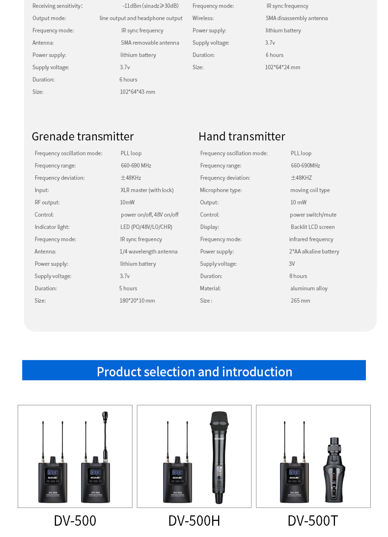 (USA: 902-928, UK: 823-832; 863-865, ROK: 925-937)Frequency Response:60Hz-17KHz+/-3dBS/N Ratio:≥105dBT.H.D:<0.5% at 1KHzDynamic Range:>100dBChannels:100Receive Sensitivity:-11dBm (sinad≥30dB)Output:3.5mm line out and earphone outControls:Power ON//OFF, Volume, SET frequencyInterface:InfraredAntenna:SMA Detachable antennaPower Supply:Lithium batteryOperating Voltage:3.7VOperating time:6hDimensions( L*W*H):102*64*43mmBody-pack TransmitterFrequency Preparation:PLL Synthesized ControlFrequency Range: UHF 660-690 MHz (606-630 MHz Optional)