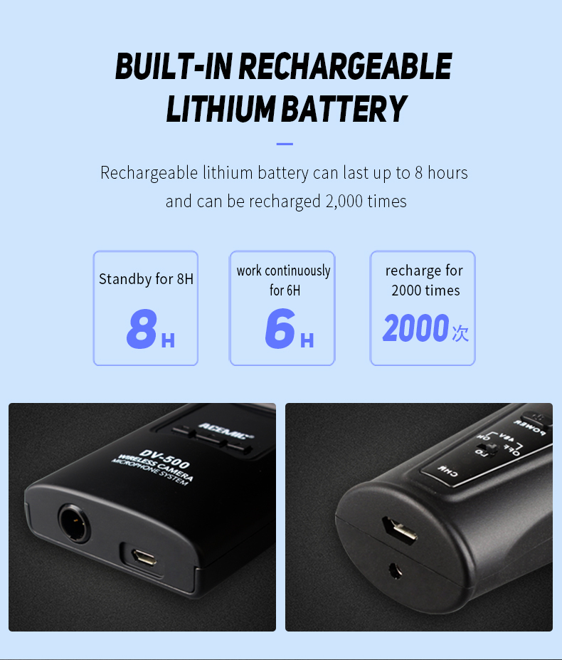 High-quality microphone, great for interviews. This handheld microphone is much better suited for loud-noise environments where the audio needs to be directly picked up by the capsule. Similar construction to other manufacturers, the microphone and receiver pair up easily and deliver crisp sound instantly. Built-in lithium batteries. If you are encountering interference, you can easily change the channel to a different one for better connection. This unit uses uhf radio bandwidth and does not interfere with Wi-Fi networks when in use. The receiver mounts to a camera shoe and delivers high-quality sound via xlr or mini Jack cables.