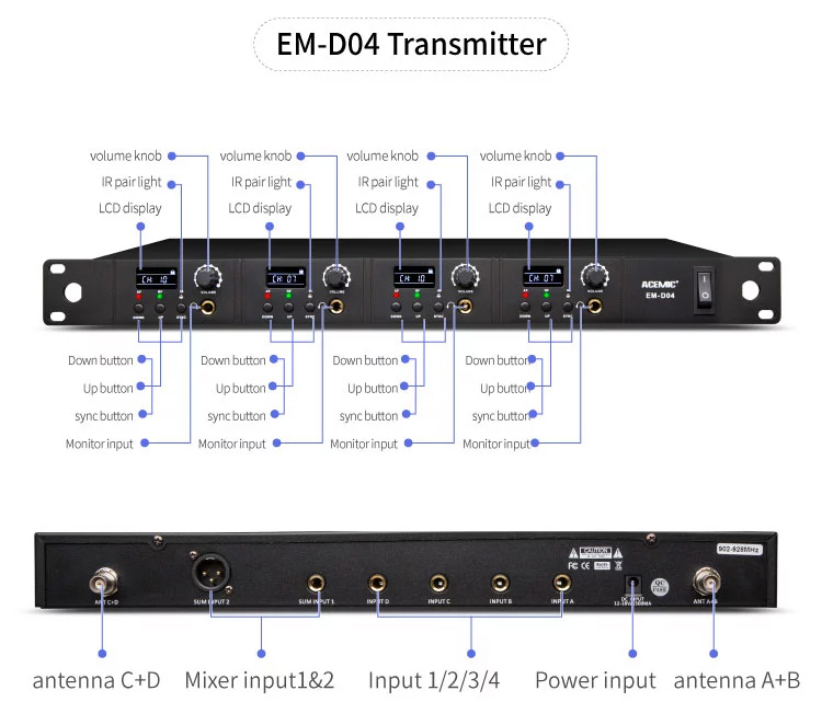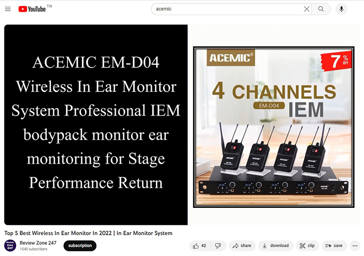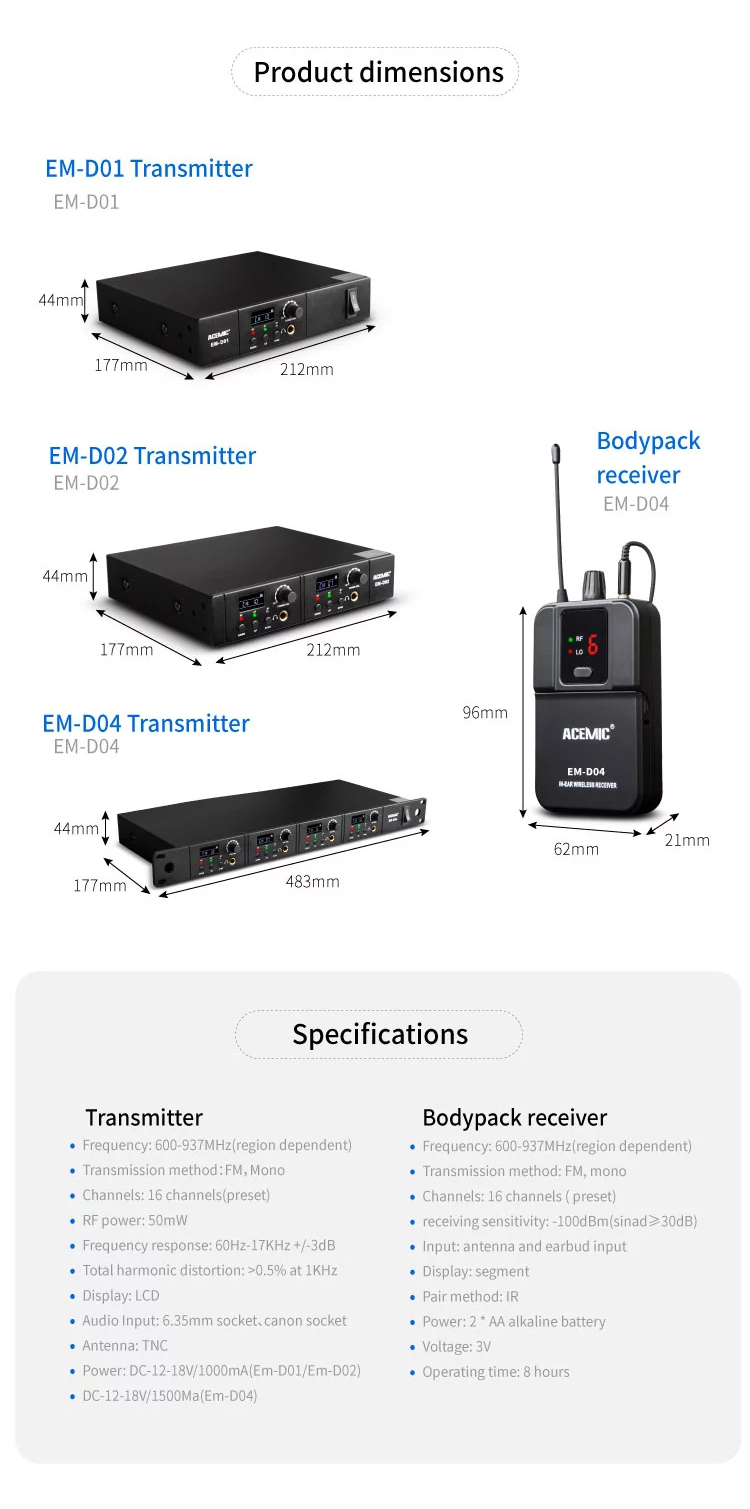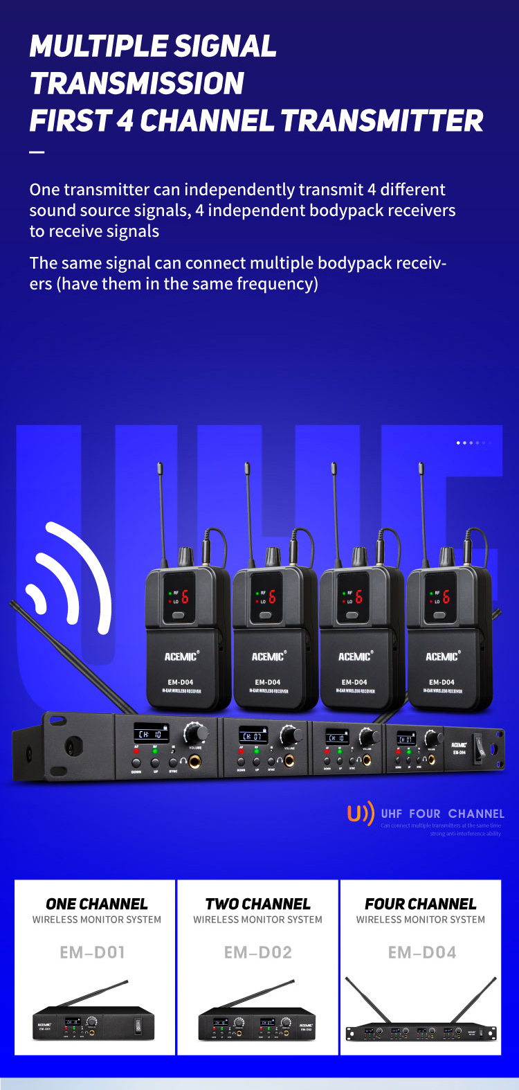 Wow!! Very Impressed. I have tried and tested the Acemic EM-D04 4-Channel Mono In Ear Monitor System. This is a Great system. If you’re looking for a budget IEM System this is the one. I have tried several other budget brands and Acemic is the best out there. The ear buds that come with this unit do work, but I use my preferred ones. This is also the case with my much more expensive unit. The body packs are made of plastic, I feel this is fine. will do the job and last awhile. I would not be afraid to use these in a harsh environment. If something were to happen to the body pack, the price to replace is very reasonable. The setup was very simple, plug in, set preferred channels, easy sync and off you go. Only 2 antennas for this 4-channel system, That’s Great. The audio is very good, you can even hear the bass. I’m very impressed how well these work.