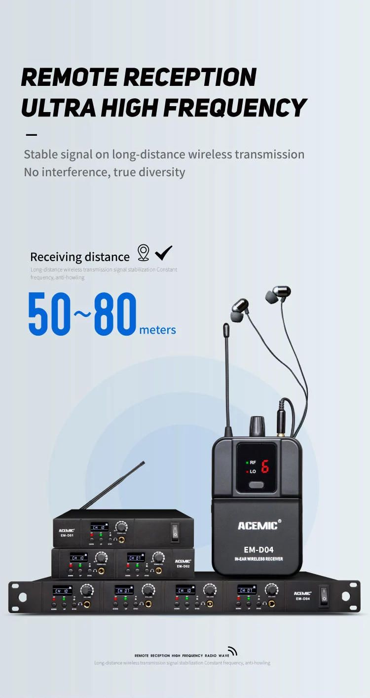 【Long Wireless Range】The wireless in-ear monitor system for whole band offers tabletop stage monitoring with a wireless range of up to 263 feet (80m), with frequency range UHF 600-928MHz. Cable-free set you free.