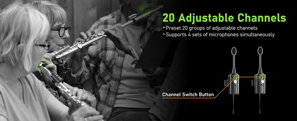【20 Preset Channels】This wireless microphone for flute and violin offers 20 adjustable preset channels to minimize potential interference and supports up to 4 systems for simultaneous use on the same occasion. To pair the systems: Short press the channel switching button of the transmitter, and the corresponding channel indicator flashes. This indicates that the channel has been automatically switched.