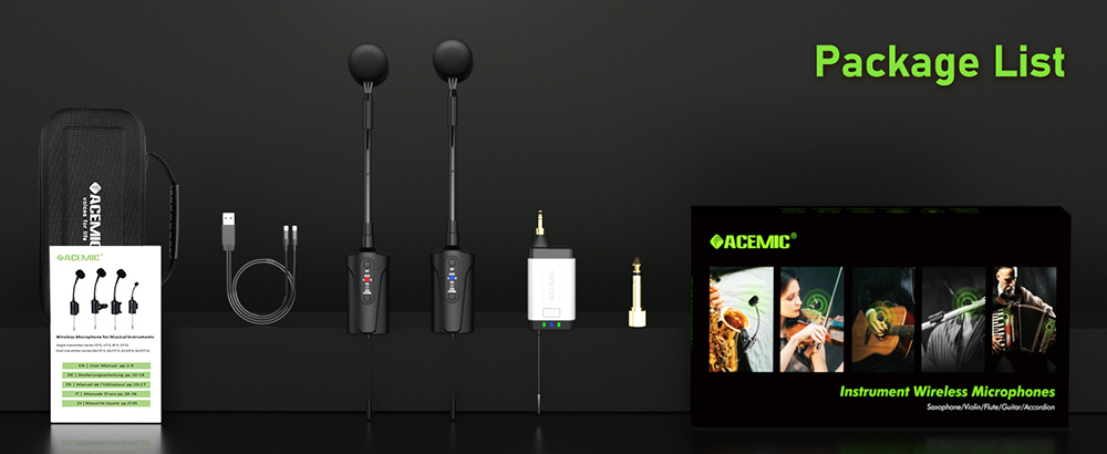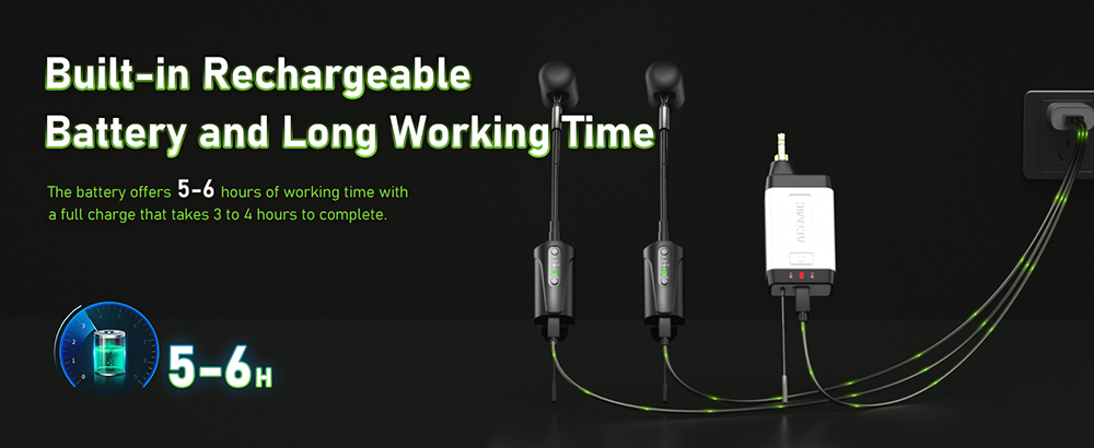 【6 Hours Continuous Use Time】The wireless flute and violin microphone system, which includes 2 transmitters and 1 receiver, each with a built-in rechargeable battery,offers 6 hours of continuous use on a single charge after a 2.5 to 3 hours charging time. Included in the package is a 2-in-1 charging cable for charging both the transmitter and receiver simultaneously. Ideal for gigs, weddings, church services, teaching, band performances, pub performances, solo musician performances, and small concerts.