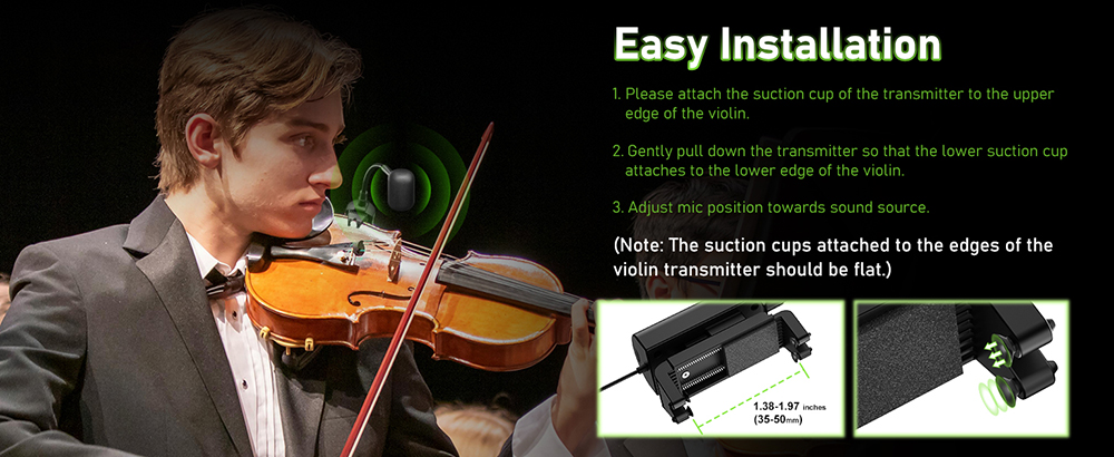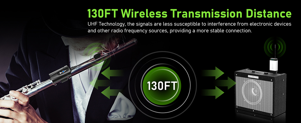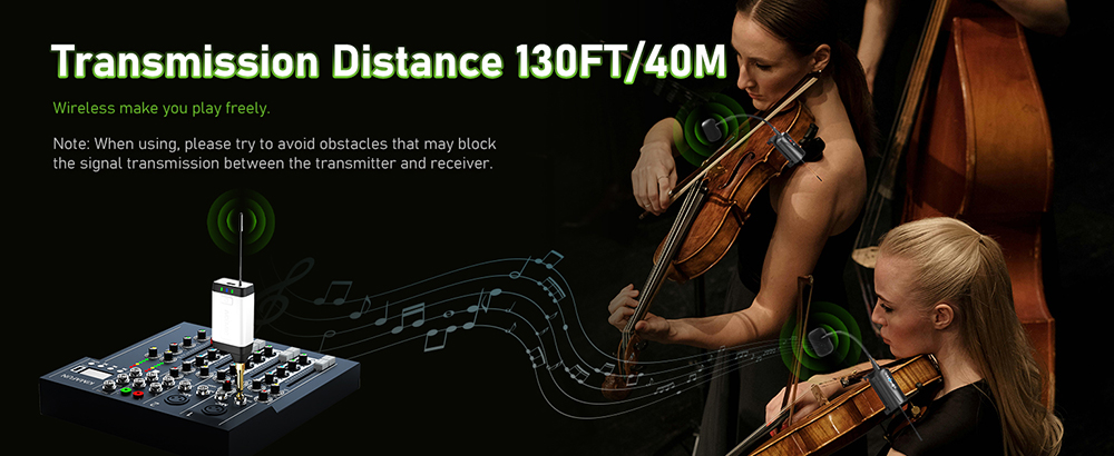 【For Flute and Violin】Q2/DV-5 is a Dual UHF instrument wireless microphone for flute and violin. The package includes 2 transmitters and 1 receiver— two transmitters can be connected to one receiver simultaneously by two flutes, or can be used interchangeably when one performer is playing for extended periods. This allows for interchanging use during extended performance periods.【UHF Stable Transmission】The wireless microphone for violin and flute utilizes UHF frequency and advanced digital audio transmission technology, featuring infrared automatic pairing, a 48kHz sampling rate, and an ultra-short audio delay. This ensures sound transmission with recording-quality clarity. The system offers stable transmission up to 40 meters (132ft) in open areas. (Note: Please ensure the antenna on the bottom of the receiver is installed before formal use.)