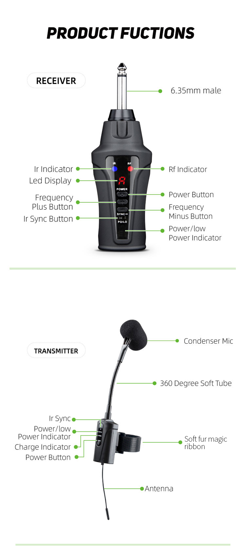 (606-630 MHz Optional), (USA: 902-928, UK: 863-865, ROK: 925-937 MHz)Frequency: Pre-set 16 selectable channelsModulation mode: pi/4 DQPSKLatency: <6msSampling: 48KHzFrequency response: 60Hz - 15KHz ± 2dBTotal Harmonic Distortion: <0.8%(1KHz)Signal/noise ratio: >92dBReceiving sensitivity: -92dBmOutput: 6.35mm plugPower supply: 3.7V Lithium batteryPower consumption: >6 hours continuously usingDimensions: 185*20*10mmTransmitterFrequency range: UHF 660-690 MHz