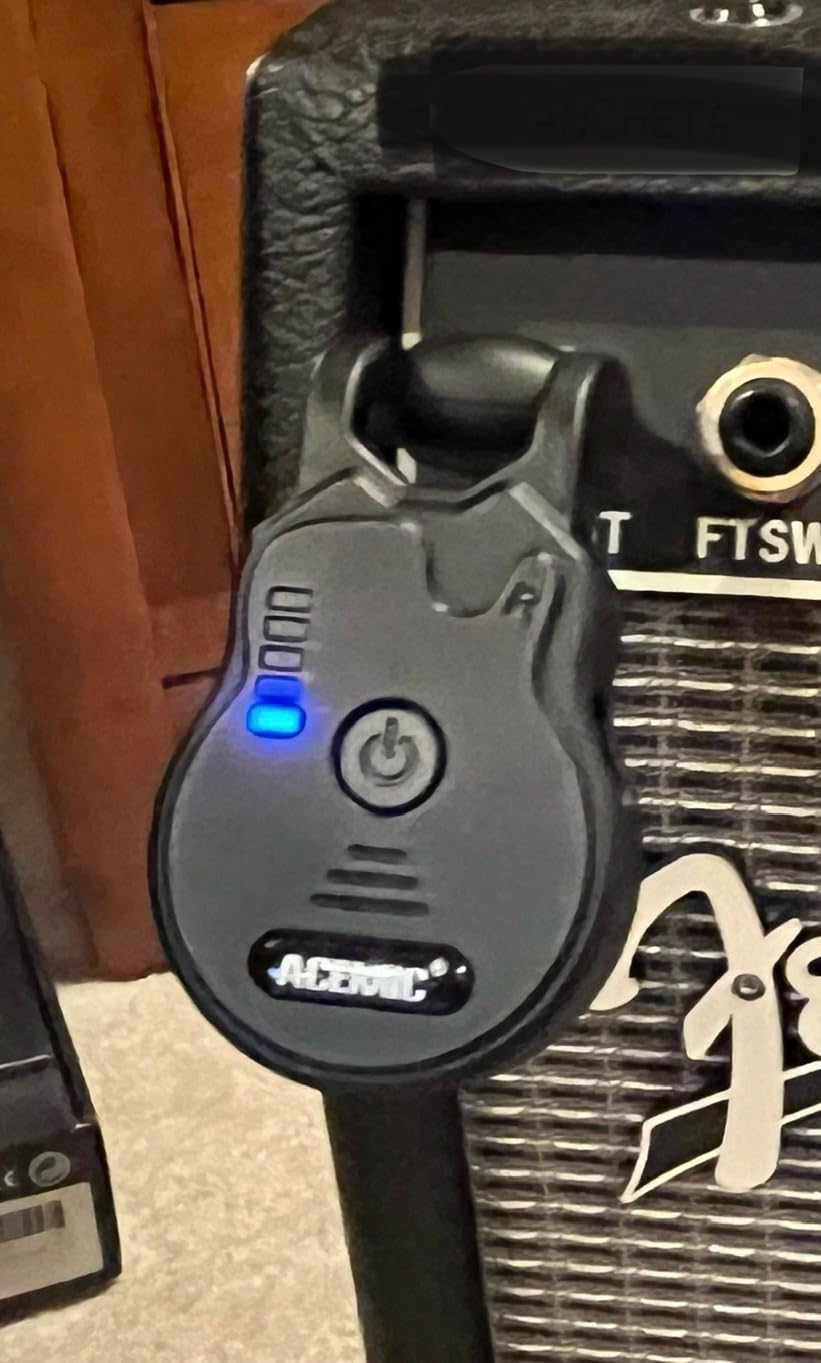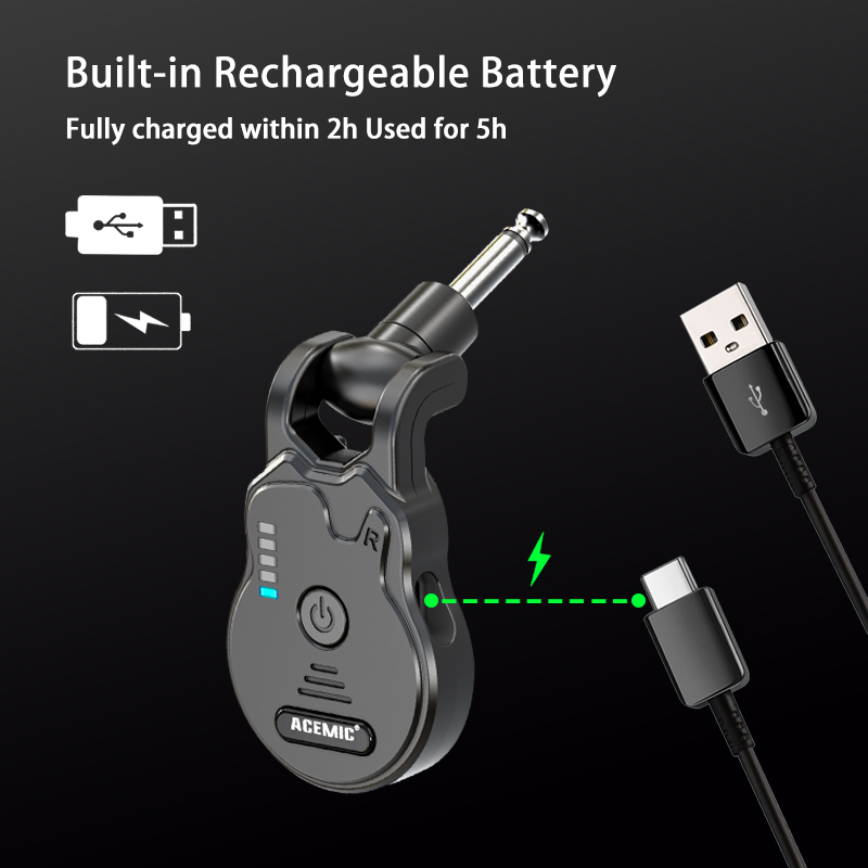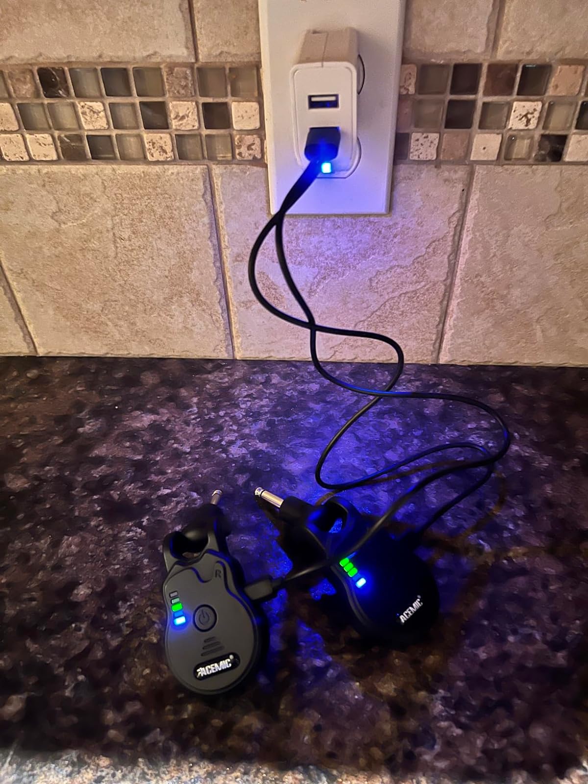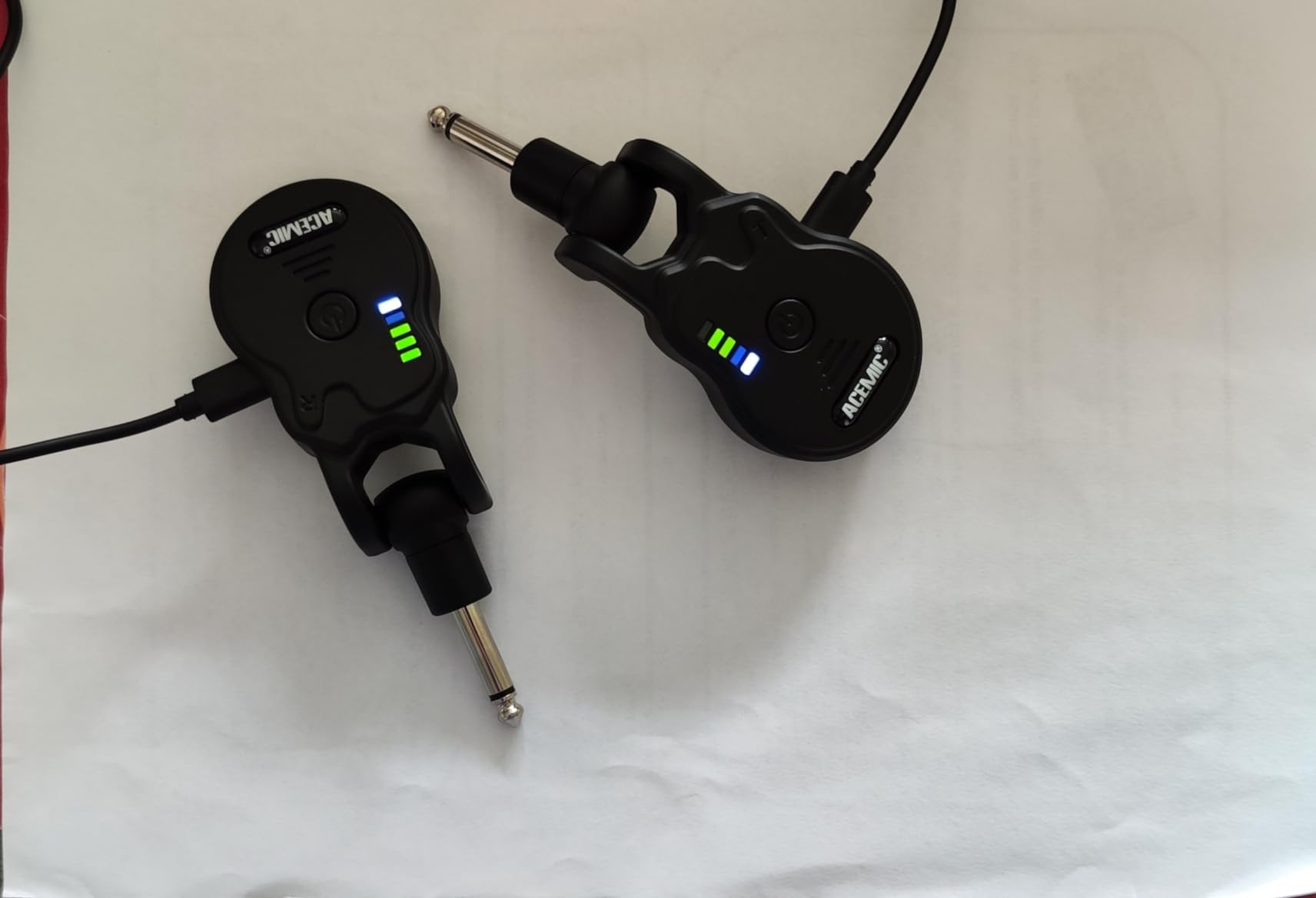 Cordless Music. This is an excellent product for keeping things clutter-free when playing your guitar. It replaces your 1/4” cables. A provided dual port USB C cable is used to charge both ends simultaneously. The charge level can be seen indicated by the remaining bars. To use, simply attach the transmitter on the instrument side and press the button until the blue light turns on and install the receiver on the amplifier side & turn on. Now you can enjoy playing your instrument cord free and move around without fear of tangling and limited distance. When tested with guitar in backyard and amp upstairs about 40 feet away, you can start to hear static. That is expected with obstruction. The delay cannot be noticed and the line-of-sight distance tested was well over 50 feet with no distortion. This will be used frequently. Completely satisfied!