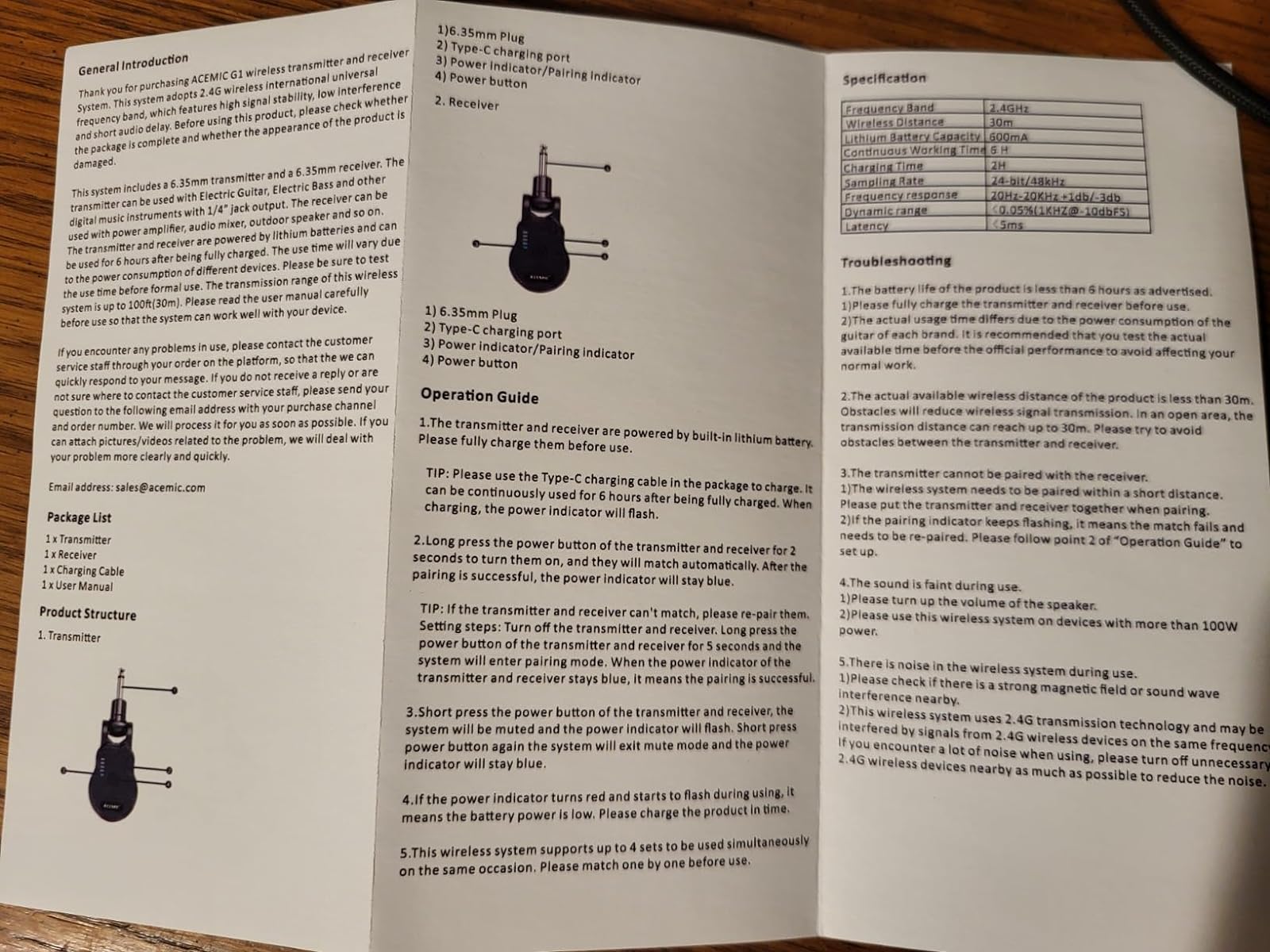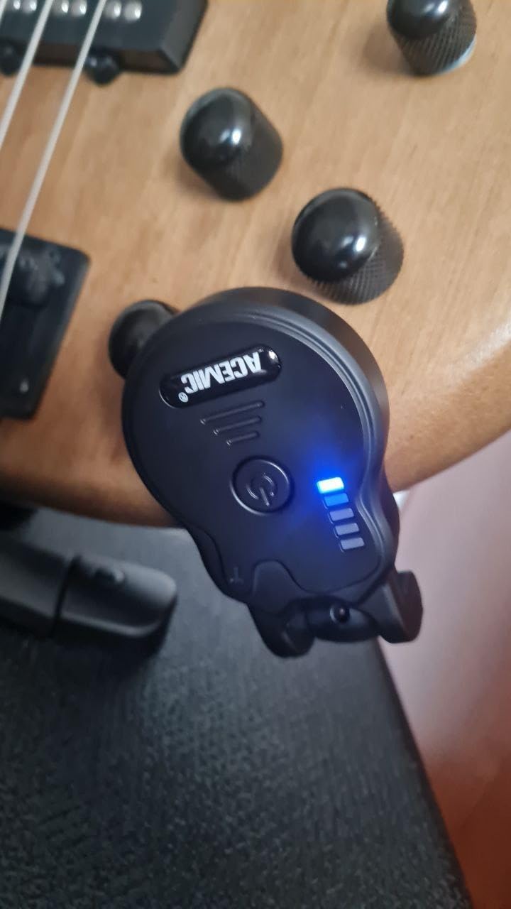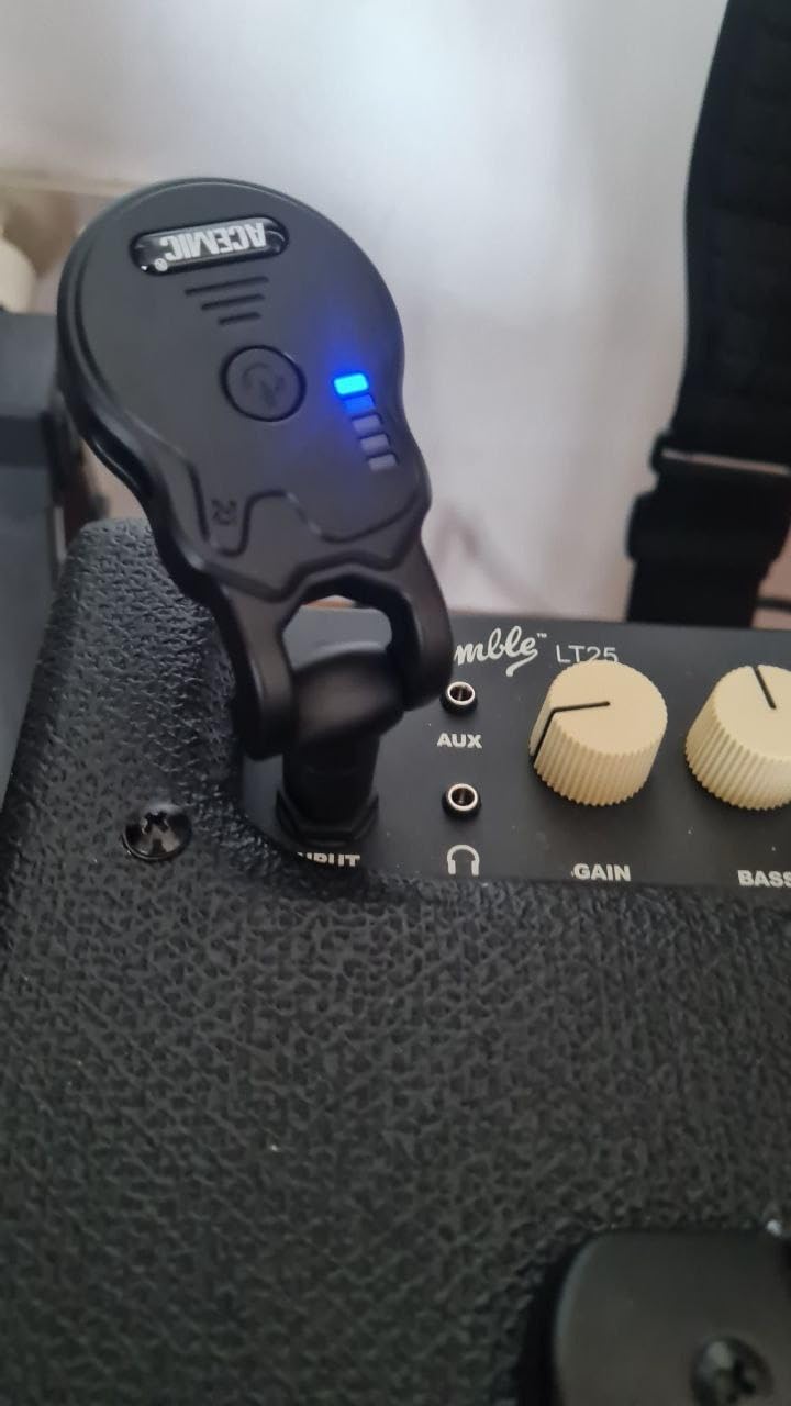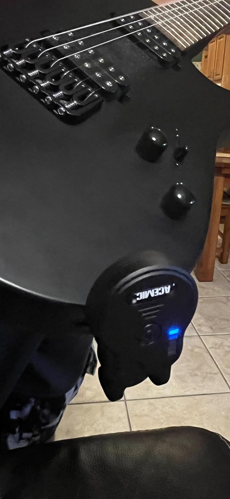 Cordless Music. This is an excellent product for keeping things clutter-free when playing your guitar. It replaces your 1/4” cables. A provided dual port USB C cable is used to charge both ends simultaneously. The charge level can be seen indicated by the remaining bars. To use, simply attach the transmitter on the instrument side and press the button until the blue light turns on and install the receiver on the amplifier side & turn on. Now you can enjoy playing your instrument cord free and move around without fear of tangling and limited distance. When tested with guitar in backyard and amp upstairs about 40 feet away, you can start to hear static. That is expected with obstruction. The delay cannot be noticed and the line-of-sight distance tested was well over 50 feet with no distortion. This will be used frequently. Completely satisfied!