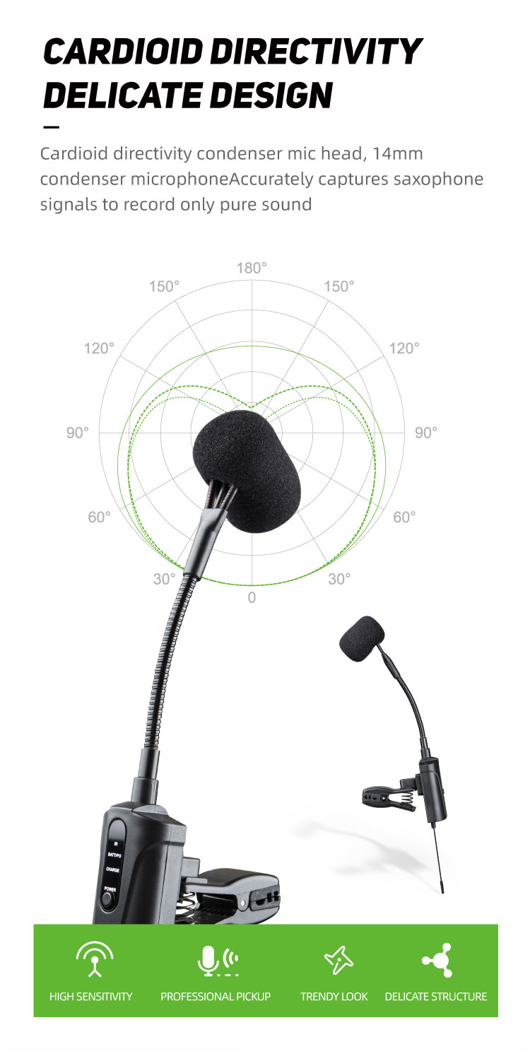 About this item:【UHF Stable Transmission】The wireless microphone for saxophone utilizes UHF frequency and advanced digital audio transmission technology, featuring infrared automatic pairing, a 48kHz sampling rate, and an ultra-short audio delay. This ensures recording-quality sound transmission. The system offers stable transmission up to 130ft in open areas. (Note: Please ensure the antenna on the bottom of the receiver is installed before formal use.)【High Quality Sound Reproduction】The wireless microphone for saxophone with its built-in highly sensitive condenser mic, perfectly captures the instrument's soundtrack, delivering sound that is clearer and more realistic. It's ideal for saxophones, trumpets, tubas, etc. It includes a 6.35mm to 3.5mm adapter for compatibility with various active PA systems, active speakers, amplifiers, and audio mixers. Also included with a carrying case for easy and secure to travel with any show.【16 Adjustable Channels】This wireless microphone for saxophone provides 16 preset groups of adjustable channels to address potential interference issues and supports up to 4 systems for use on the same occasion. To pair the systems, match the first transmitter with the first receiver by setting them to the same channel. When pairing the second set, it is recommended to select a channel number that is more than 3 channels apart from the first one. Follow the same method for subsequent systems until all four are matched.【Flexible Gooseneck Design】The wireless microphone for saxophone clip featuring rubber padding, is firm and steady, leaving no damage to your saxophone, trumpet, tuba, etc. The gooseneck is designed for flexibility and crafted from high-quality materials, ensuring stability and ease of adjustment without the annoying rebound.【6 Hours Continuous Use Time】This wireless microphone for saxophone equipped with a built-in rechargeable battery, offers 6 hours of continuous use after a 2 to 3-hour charge. Included in the package is a 2-in-1 charging cable for simultaneously charging both the transmitter and receiver. Ideal for gigs, weddings, church, teaching, band performances, pub shows, personal musician performances, and small concerts.