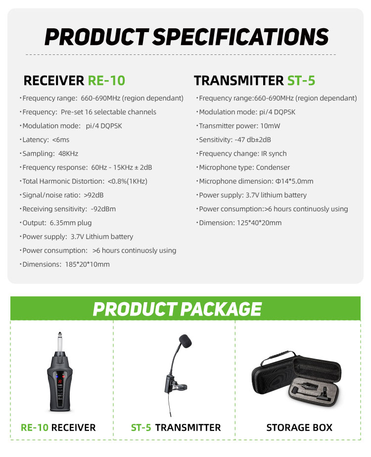 (606-630 MHz Optional), (USA: 902-928, UK: 863-865, ROK: 925-937 MHz)Frequency: Pre-set 16 selectable channelsModulation mode: pi/4 DQPSKLatency: <6msSampling: 48KHzFrequency response: 60Hz - 15KHz ± 2dBTotal Harmonic Distortion: <0.8%(1KHz)Signal/noise ratio: >92dBReceiving sensitivity: -92dBmOutput: 6.35mm plugPower supply: 3.7V Lithium batteryPower consumption: >6 hours continuously usingDimensions: 185*20*10mmTransmitterFrequency range: UHF 660-690 MHz