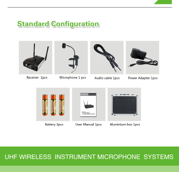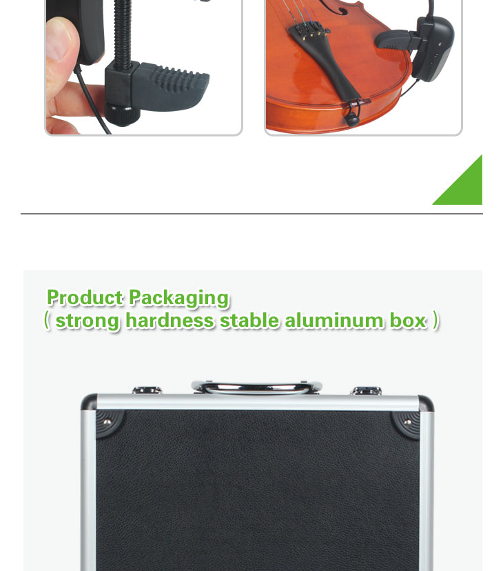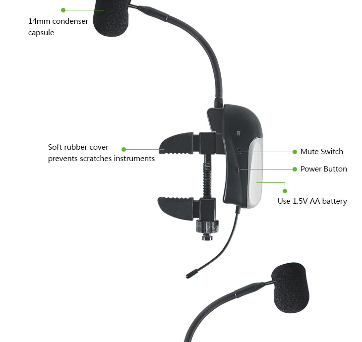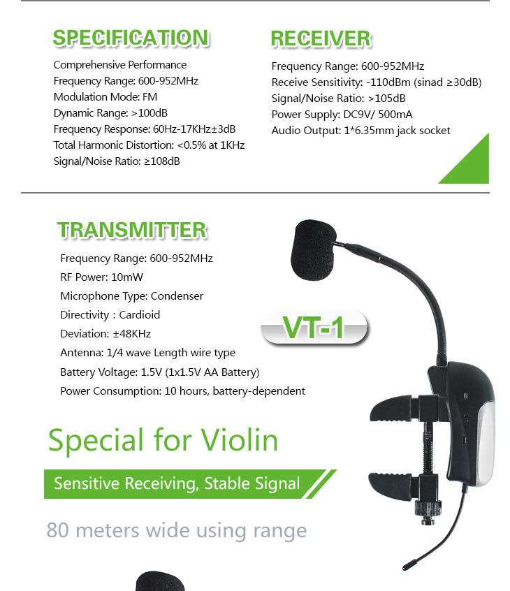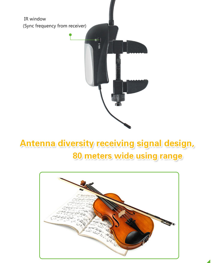 About this item【Enjoy interaction with audience】 The wireless violin microphone uses a digital chip circuit design to enhance stable signal transmission distance up to 262ft (80 meters). You are going to focus and enjoy the freedom of performance and the interaction with your audience.【No damage on your violin】The specially designed wireless violin microphone system clip with virgin rubber sleeve is firm and steady without leaving damage to your violin.【Easy and Handy】The wireless violin microphone comes with basic ECHO function, 100 preset UHF channels (600-928MHz), and LCD Indicators with crucial information such as RF/AF Signal, Group, Channel, Frequency, Battery Level.【No frustration adjusting angle】The wireless violin microphone system gooseneck is well designed and made of first-class bronze material. It's steady and easy to adjust without the annoying rebound.【High efficient batteries】 The battery life is up to 10 hours. With the included power adapter, you are able to play the wireless violin microphone for a long time. It can offer secure stamina for your performance.【Compact and light】 The wireless violin microphone is small and light. It comes with a travel carrying case that makes it easy and secure to travel with.