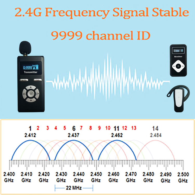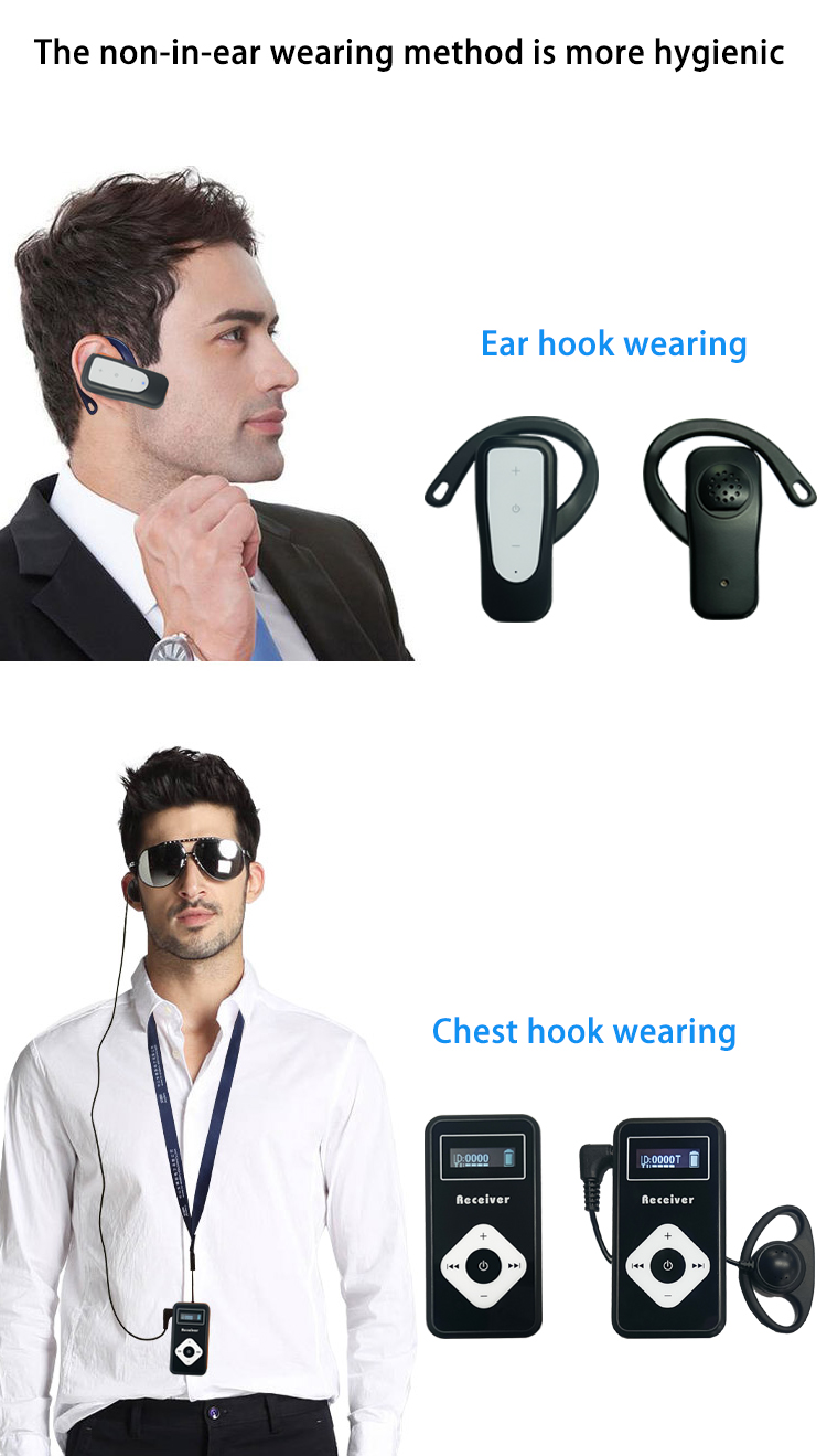 【Receivers Could Hear Voice from 2 Transmitters Simultaneously】The audio guide system could help the presenter transmit audio voice messages to an audience at a comfortable level without having to shout. The presenter speaks into a mic-transmitter and the audience use lightweight ear-hook receivers to hear the message.What makes it amazing is that receivers could hear voice messages from two transmitters on the same channel,it means that each group support two presenters speaking simultaneously.