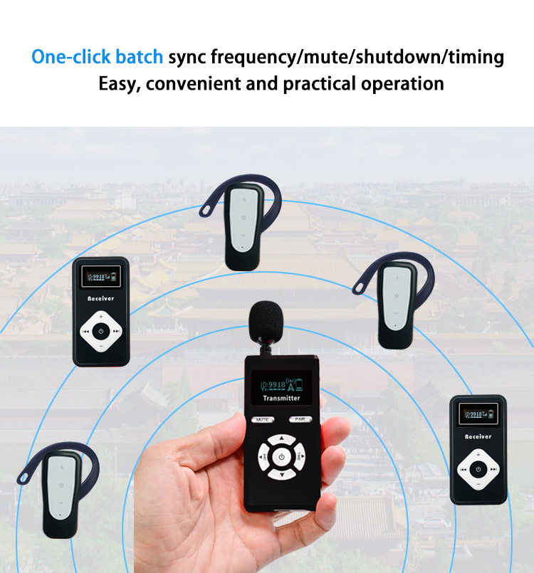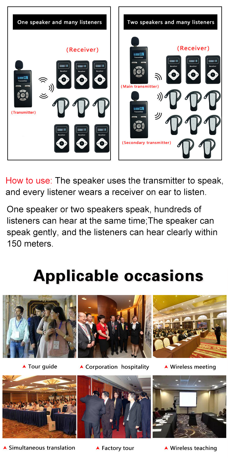 【Receivers Could Hear Voice from 2 Transmitters Simultaneously】The audio guide system could help the presenter transmit audio voice messages to an audience at a comfortable level without having to shout. The presenter speaks into a mic-transmitter and the audience use lightweight ear-hook receivers to hear the message.What makes it amazing is that receivers could hear voice messages from two transmitters on the same channel,it means that each group support two presenters speaking simultaneously.