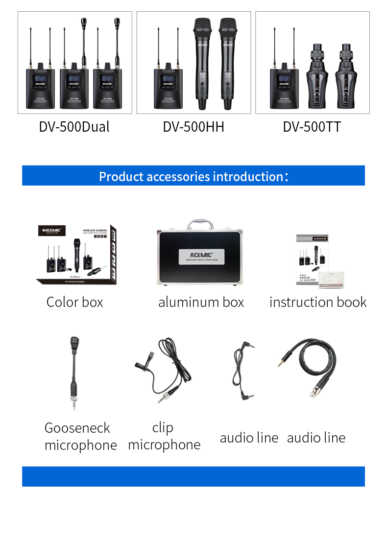 About this item:【Superior Sound & Noise Reduction】The wireless camera microphone features UHF Ultra High-Frequency radio wave technology and dual-antenna design, which enhances the anti-interference ability to ensure stable signal transmission and record clear sound. It features intelligent noise reduction function, can significantly reduce environmental and wind noise.【Wide Compatibility】You can mount the receiver to DSLR Camera, XLR Camcorder, iPhone, Android smartphone, Laptop and PC. The wireless camera microphone is widely used for YouTube live streaming, Vlog recording, interview, program hosting, podcast, presentation, church, wedding.【100 Selectable UHF Channels】The wireless camera microphone package includes 1 Receiver+2 transmitters, so the DV-500Dual support 1-2 people recording at the same time. Every transmitter can select 2 channels, flexible channel matching. When other channels are disturbed in the same space or near distance, you can quickly switch the channel to prevent interference. Working range of the microphone system up to 164 feet (50 meters) in open areas.【Charge and Work Time】The Transmitter and Receiver are built-in 1000 mAh rechargeable lithium-ion batteries that can offer about 6-8 hours working time. USB cable has several mini USB for charge for the transmitters and receiver at the same time, fully charge is only 2.5 hours. The red light is on during charging and goes off when fully charged.【Real-time Audio Monitoring】Connect your favorite headphones to the receiver's 3.5mm headphone jack, you can listen the sound while recording, and monitor the audio status to complete the recording at one time. Daylight-readable displays on the transmitters show volume, battery status and channels.The wireless camera microphone display on the receiver show connection quality of every transmitter and battery status.